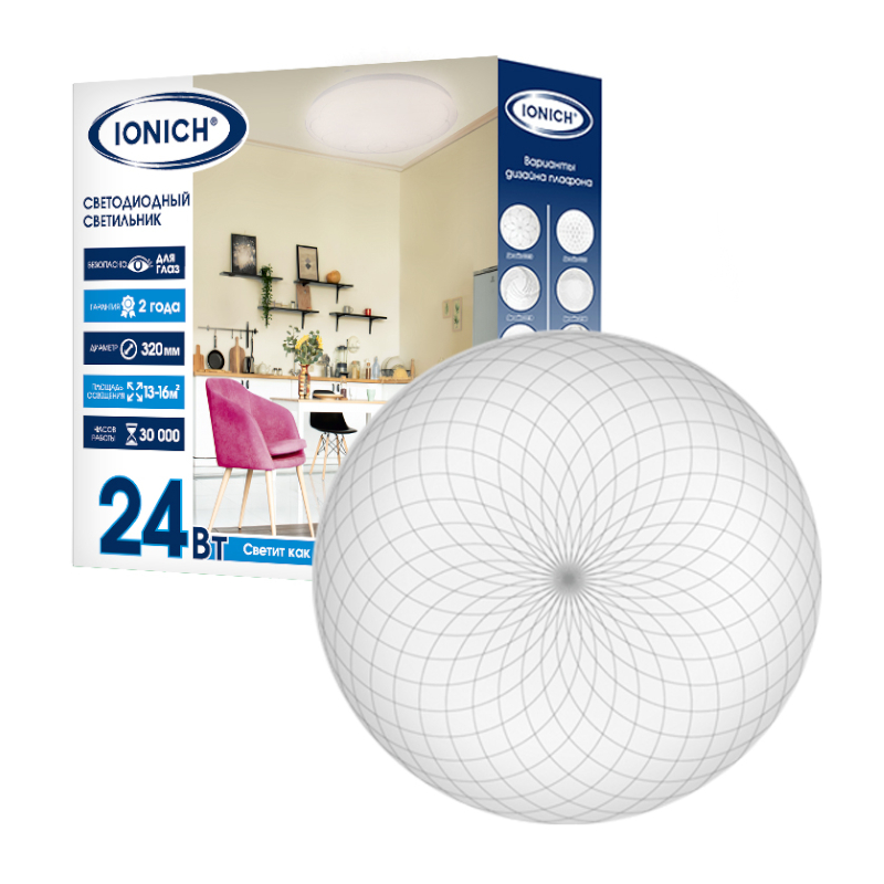 Светильник светодиодный акриловый 320мм IONICH "Кассиопея"24Вт 6500К 1680Лм IP20 белый S=13-16м2 1109*1/20