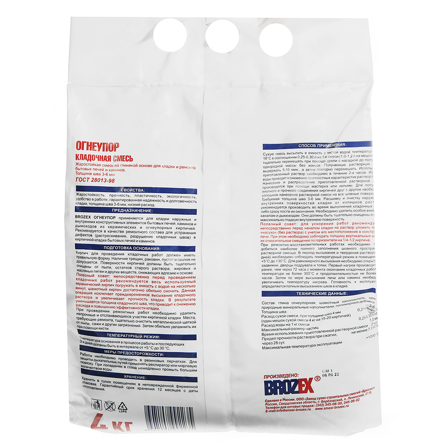 штСмесь кладочная BROZEX Огнеупор KF 22 — жаростойкий состав для кладки и ремонта каминов, дымоходов, барбекю, костровых зон, термокупелей, печей для дома, кухни, бани, сауны. Сохраняет свои свойства при нагреве до 1200 °C.