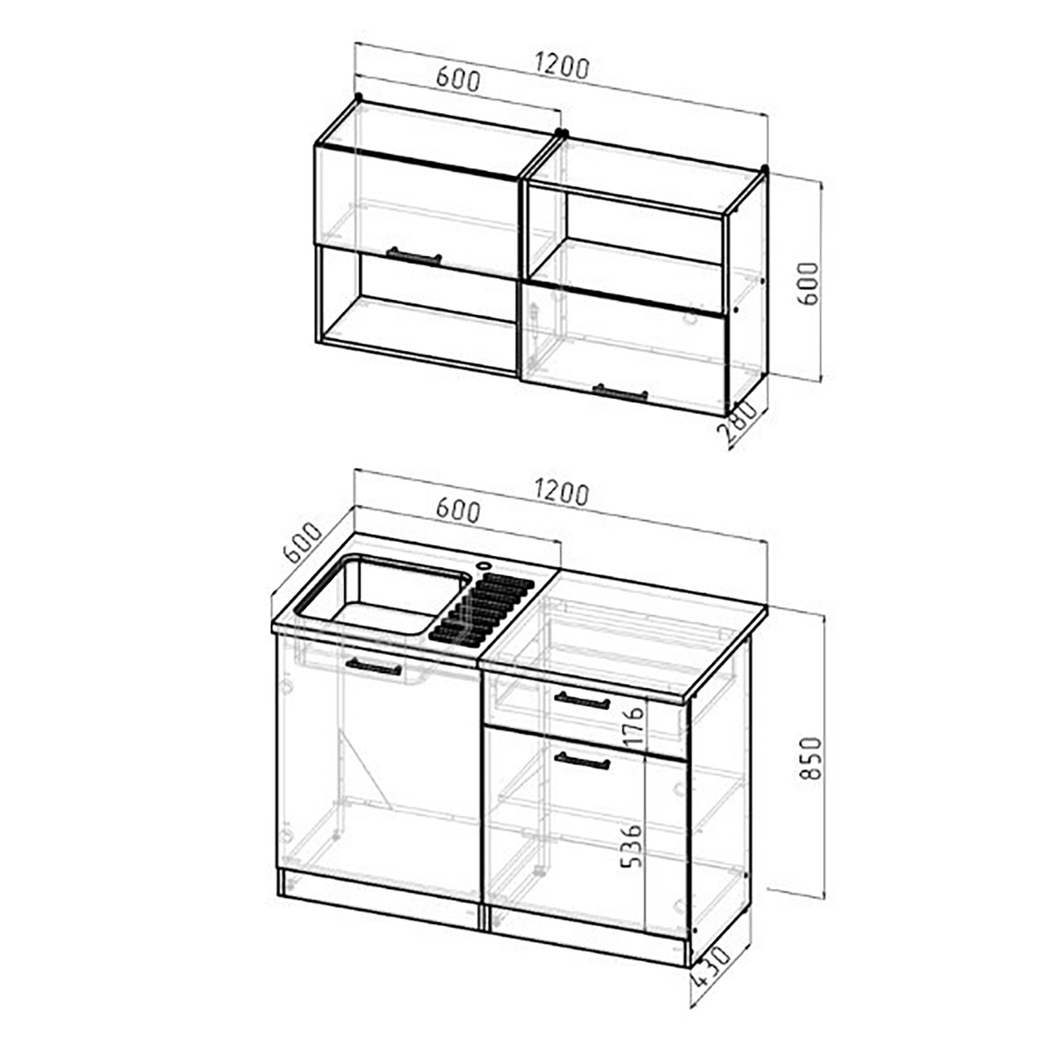 *мойки, смесители и посудосушители в комплекты гарнитуров не входят.