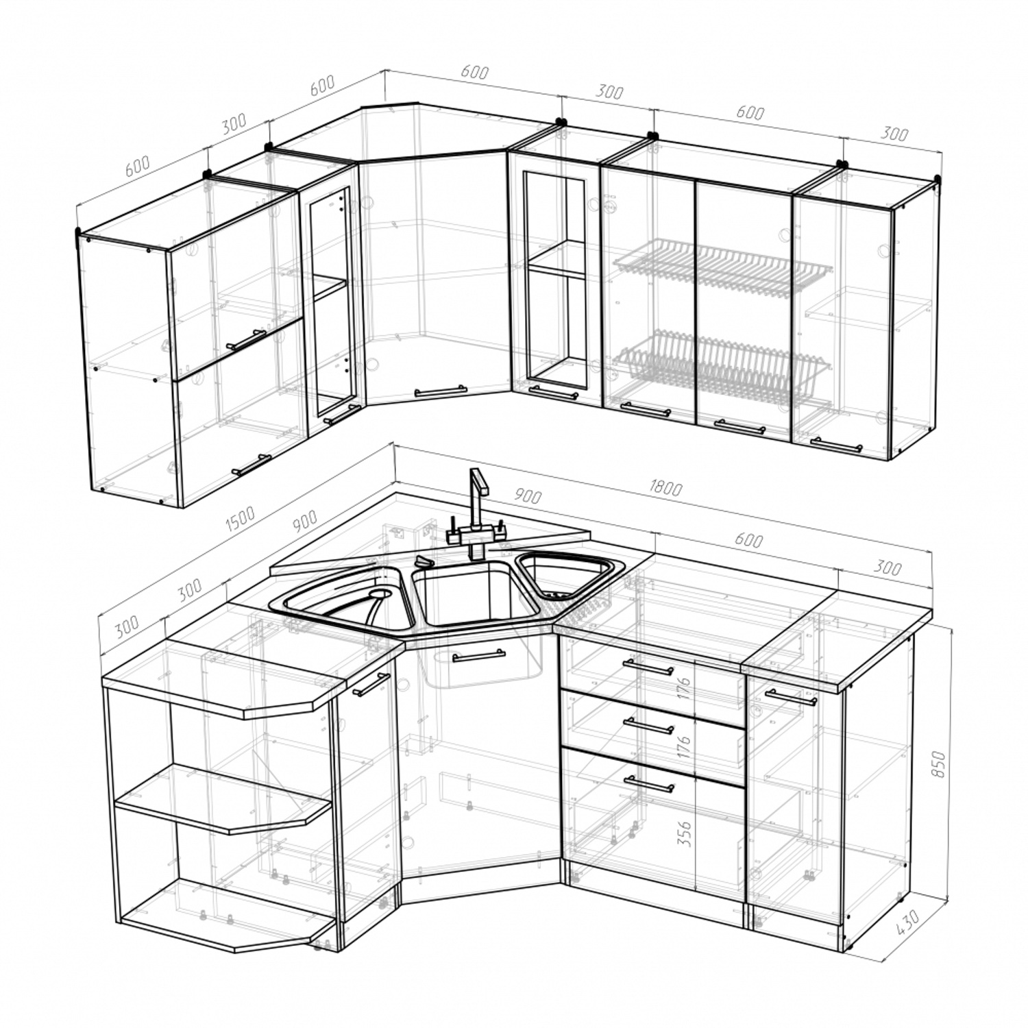 *мойки, смесители и посудосушители в комплекты гарнитуров не входят.