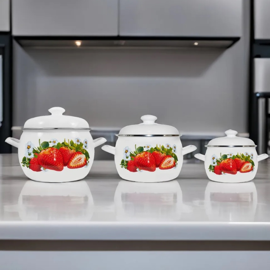 яяяНабор кастрюль эмалированных: 2,0л+3,5л+5,0л рис."Сочная клубника" С-207АП2/4 "Лысьвен ЭМАЛИ" *1