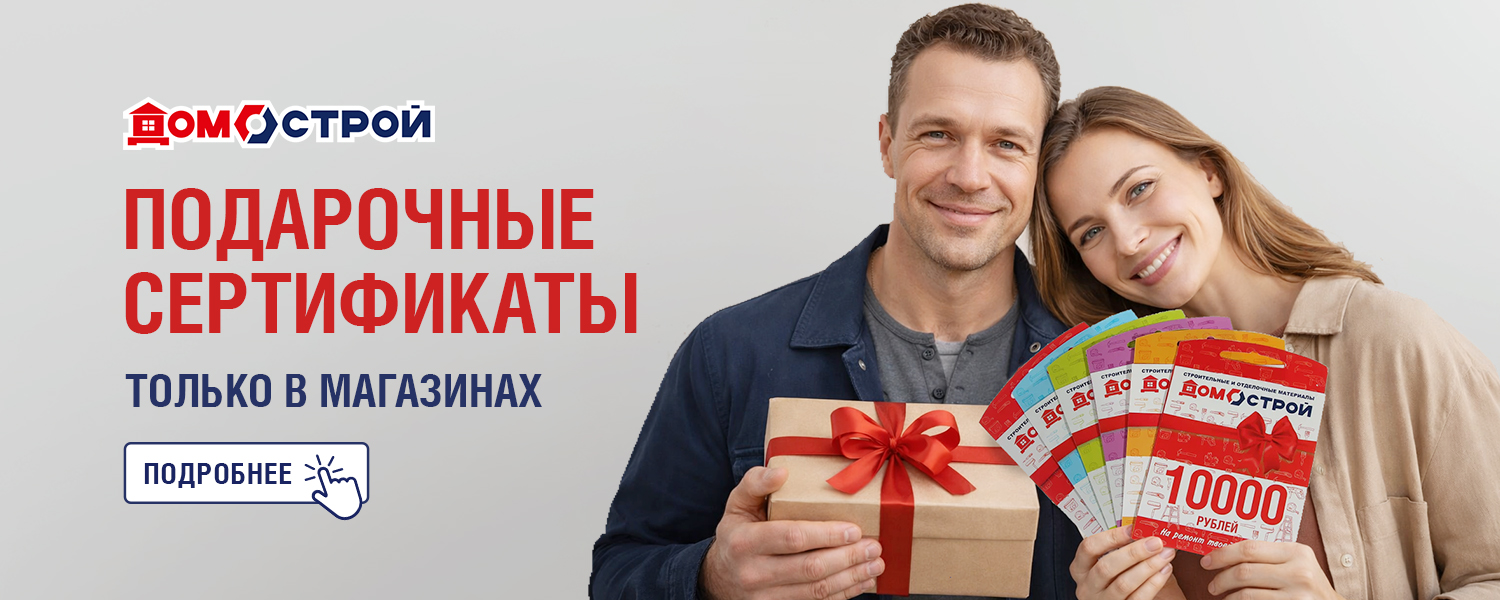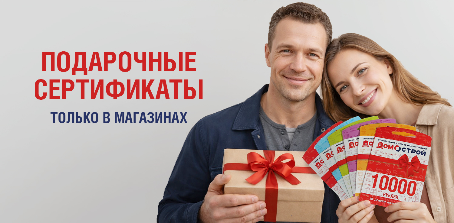 * Номиналы подарочных сертификатов в разных городах и магазинах могут отличаться. Наличие сертификатов определенных номиналов уточняйте у сотрудников розничных магазинов ДомоСтрой.