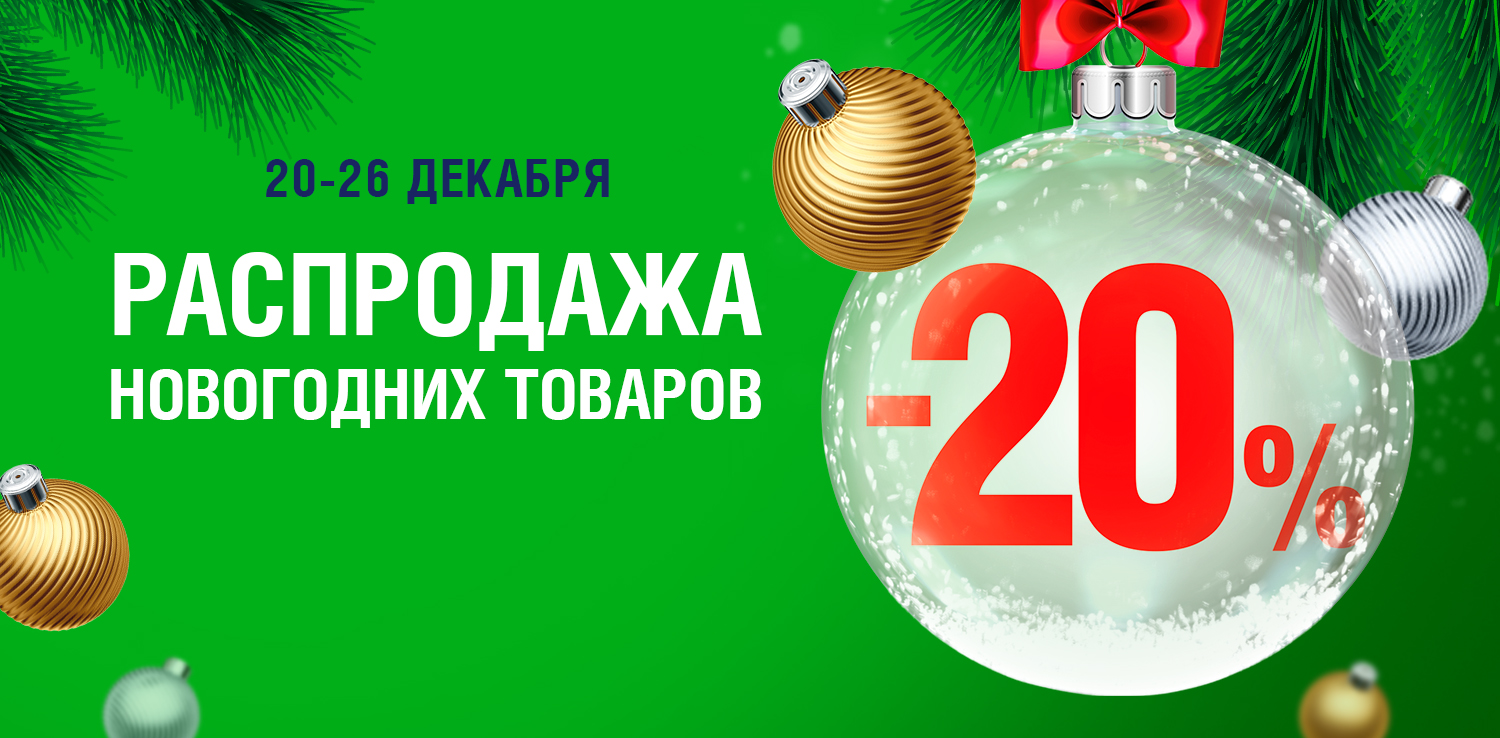 Успейте воспользоваться скидкой 20% на новогодний ассортимент с 20 по 26 декабря! Это отличный шанс сэкономить на праздничных покупках и создать незабываемую новогоднюю атмосферу в вашем доме. Скидка действует на весь новогодний ассортимент. Все товары, участвующие в акции, отмечены на сайте шильдиком «РАСПРОДАЖА». Цены на товарах указаны уже с учетом скидки.