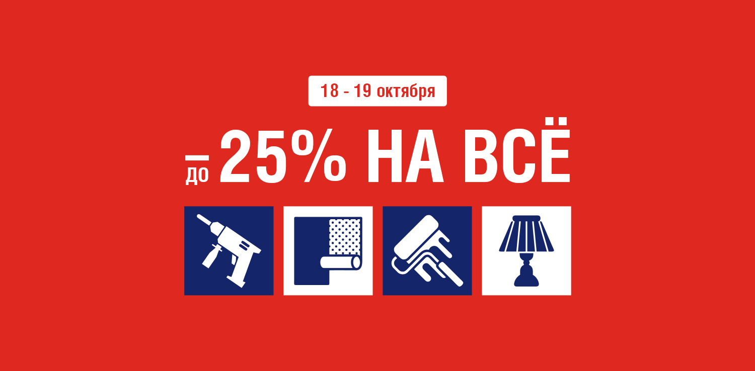 Только 18 и 19 октября в розничных магазинах ДомоСтрой и на сайте — скидки до 25% на все товары. Это отличная возможность приобрести строительные материалы, инструменты, товары для дома и сада по привлекательным ценам!